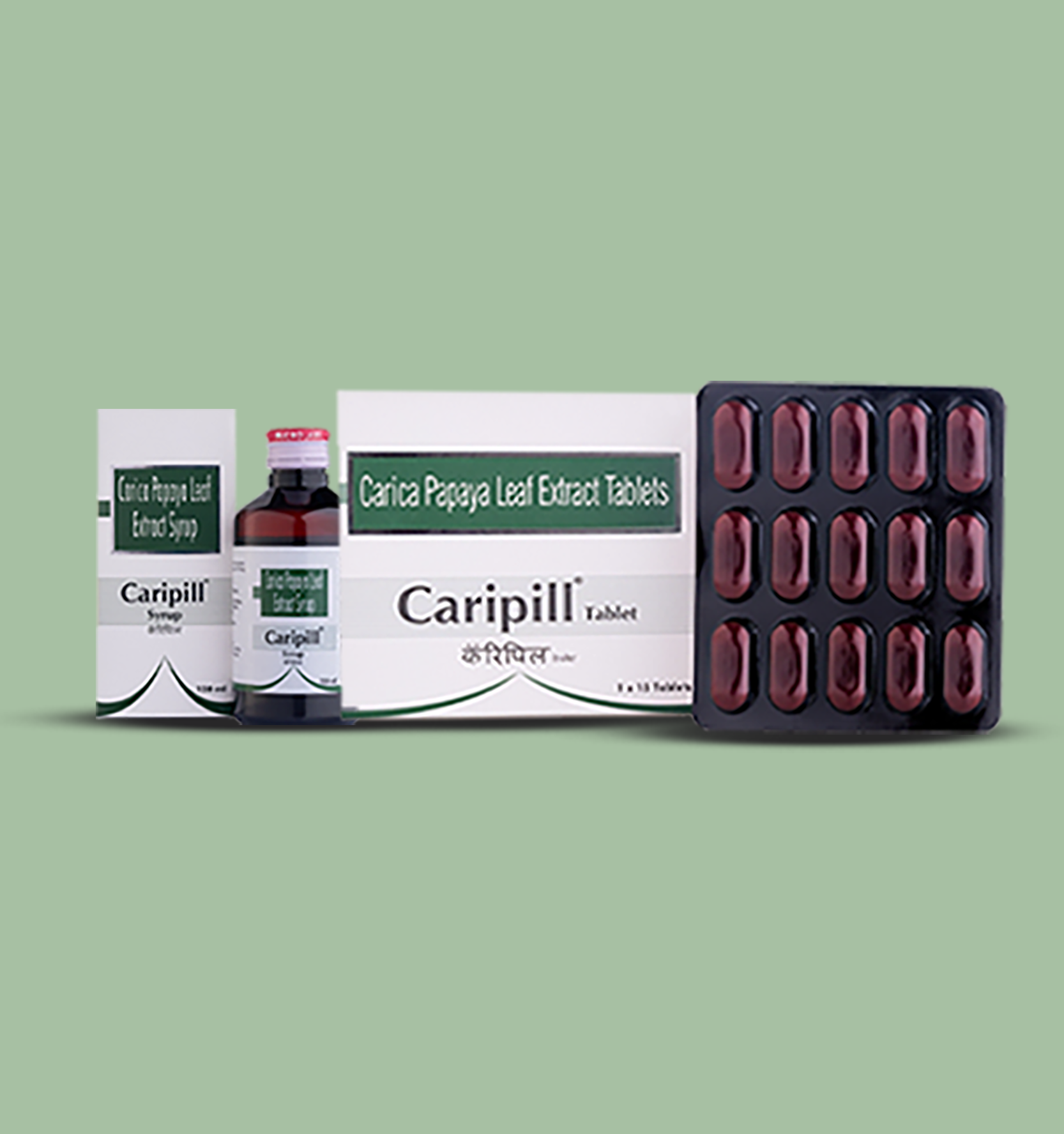 Caripill is a medicinal product available in both tablet and syrup forms, comprising papaya (Carica papaya) leaf extract.